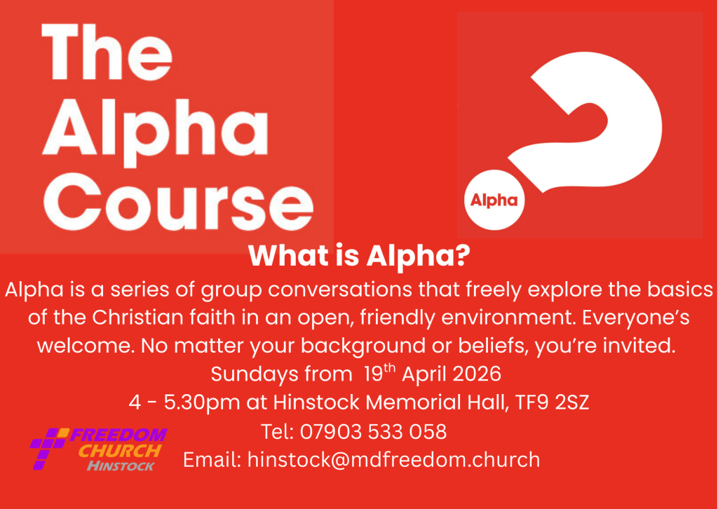 Sunday 19th April – 4pm – 5.30pm Alpha Course begins at Hinstock Memorial Hall TF9 2SZ