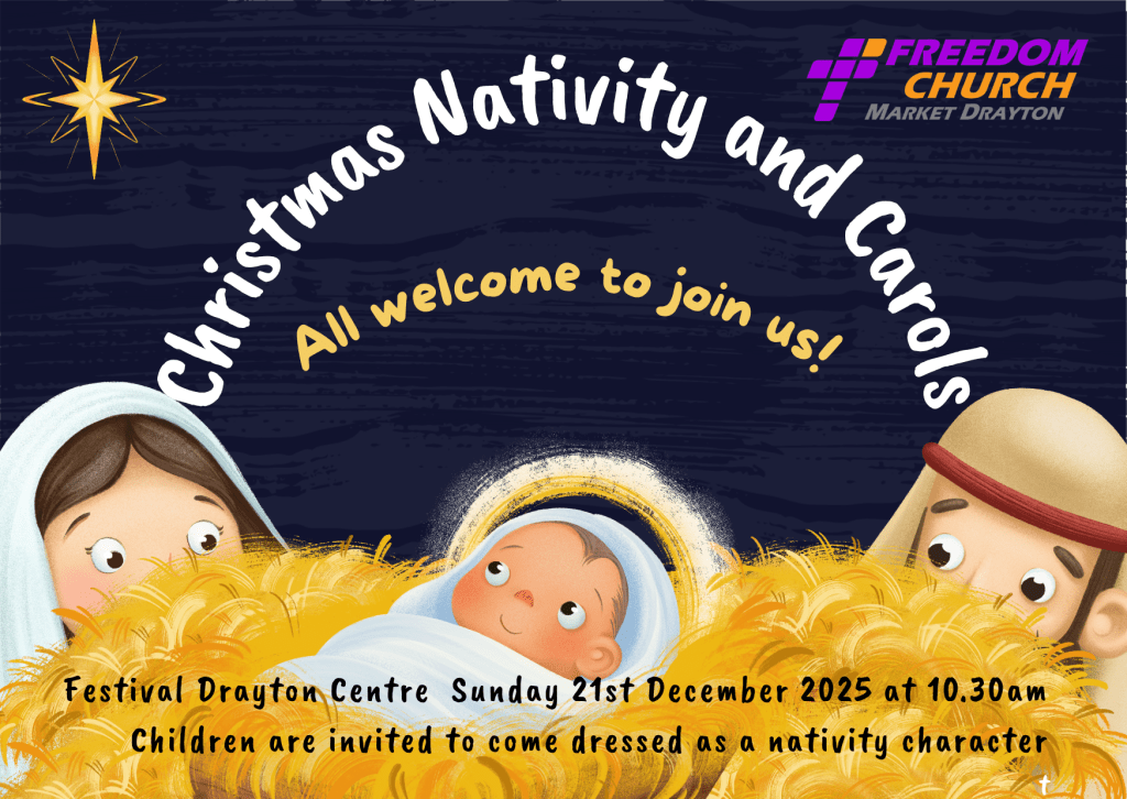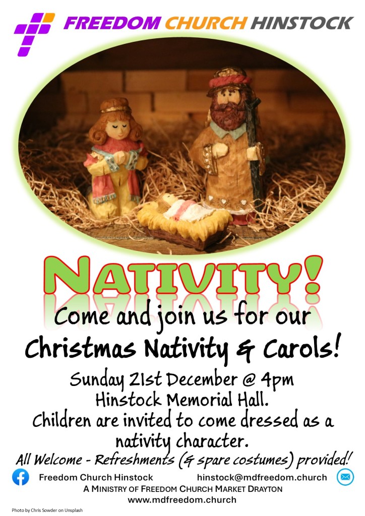 Sunday 21st December – 4pm Freedom Church Hinstock Memorial Hall TF9 2SZ Nativity and carols – all children are invited to come dressed as their favourite nativity character.