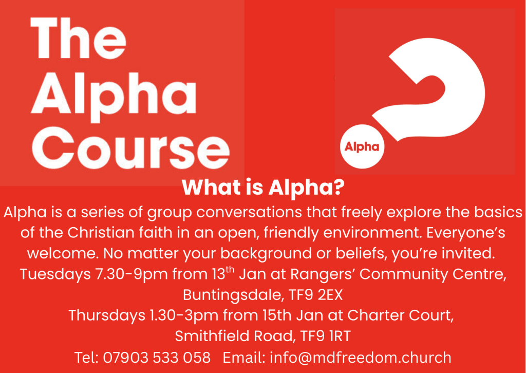 Thursday 15th January – 1.30-3pm Alpha Course starts at Charter Court Community Room, TF9 1RT – all welcome to join us.
